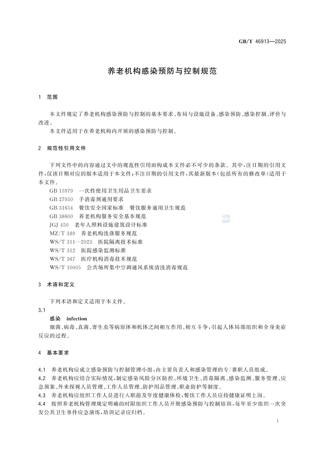国家标准:《养老机构感染预防与控制规范》