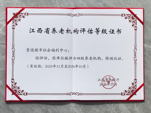 近日,省民政厅通报了2023年度江西省养老机构等级评定结果,全省29家养老机构通过评审,其中,五级养老机构1家、四级养老机构7家,三级养老机构21家。景德镇市社会福利中心荣誉上榜,获评为江西省“四级养老机构”。